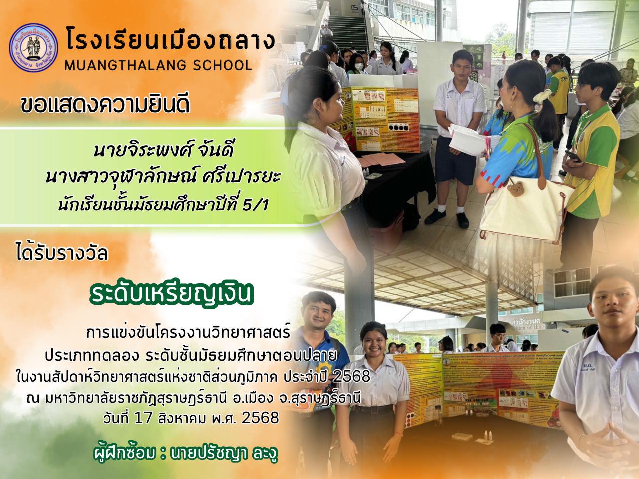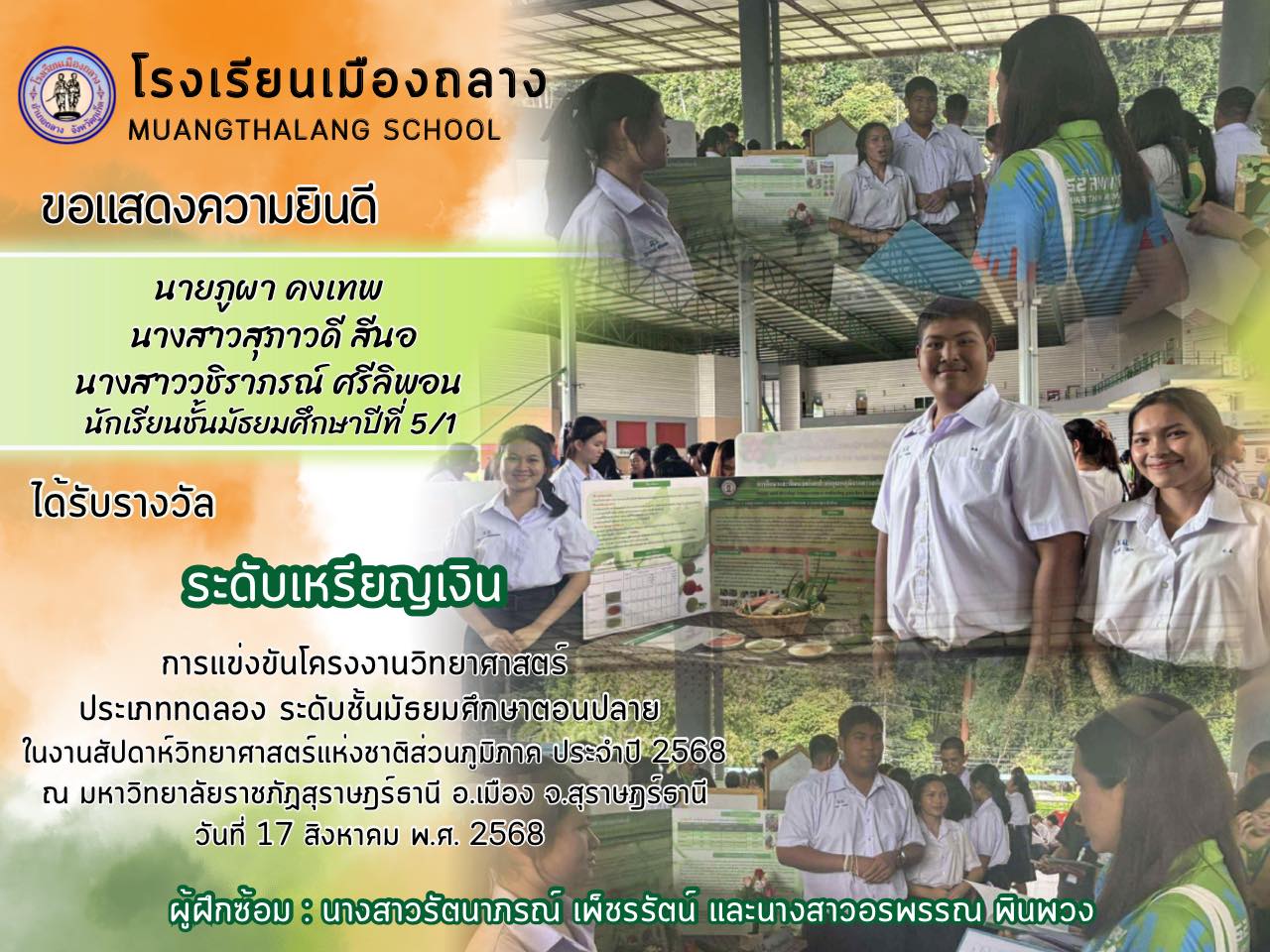 ชื่อผลงาน : ได้รับรางวัลรองชนะเลิศอันดับ 1 การแข่งขันประกวดโครงงานสิ่งประดิษฐ์ทางวิทยาศาสตร์ ระดับชั้นมัธยมศึกษาตอนต้น