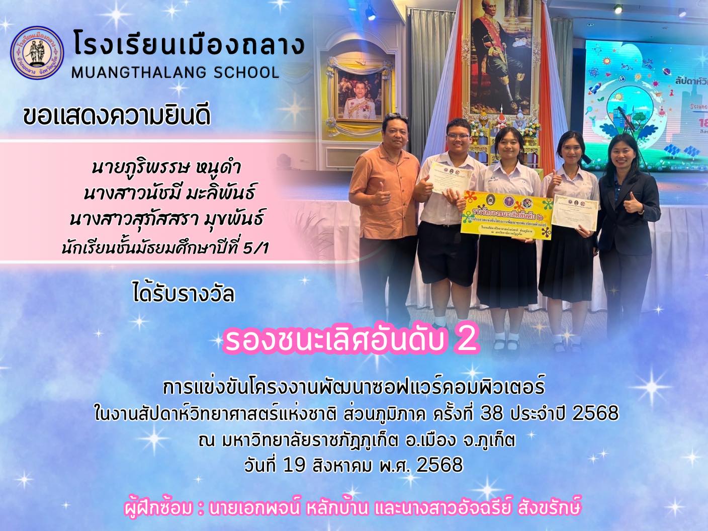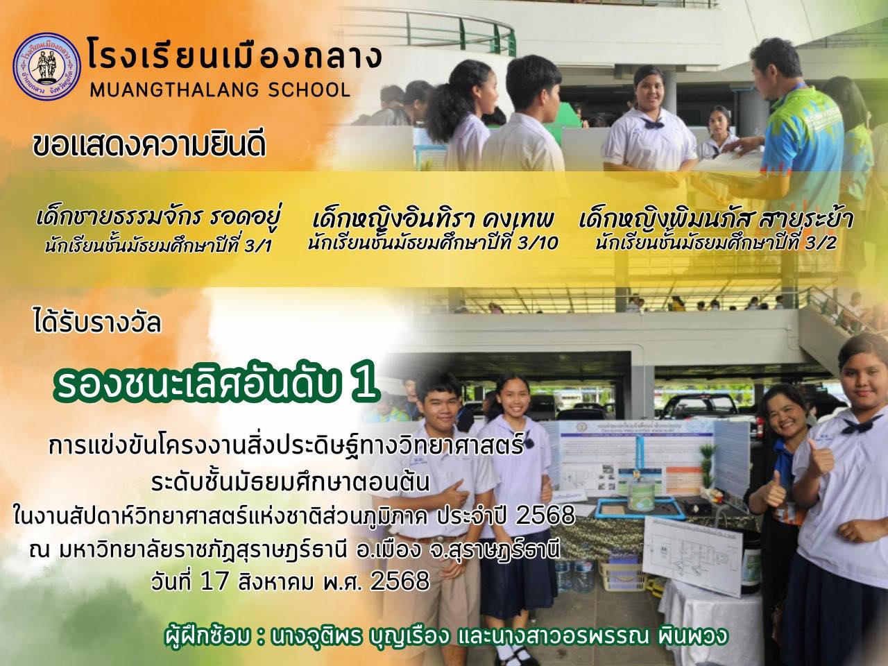ชื่อผลงาน : ได้รับรางวัลรองชนะเลิศอันดับ 1 การแข่งขันประกวดโครงงานสิ่งประดิษฐ์ทางวิทยาศาสตร์ ระดับชั้นมัธยมศึกษาตอนต้น